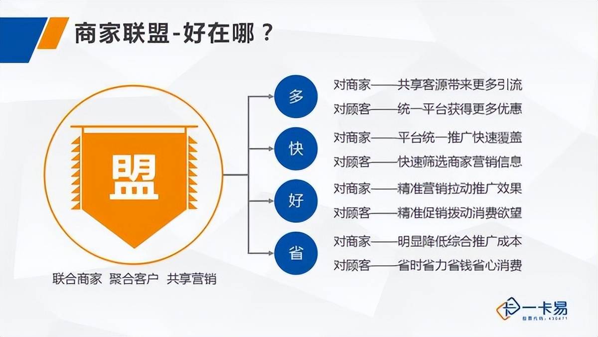 那么对于商户来说,商户可以通过加入到自己的家里。还有一种团购套餐,从线下引流到我们的线下领域消费,按照引流的方式,通过优惠券去引流到线下去销售,或者说整个联盟会员跟那个门店的一些优惠再去旅游到线下商城来线上的平台一种方式,其实对于整个而言,就是相对于说把我们之前异业联盟那些零散的客户,整合到用一个联盟卡去形成一个相对比较清晰的一个汇源内容方式。那么,联盟卡的一些功能体现、技能来说,也是围绕着我们前面所说的几点去做。