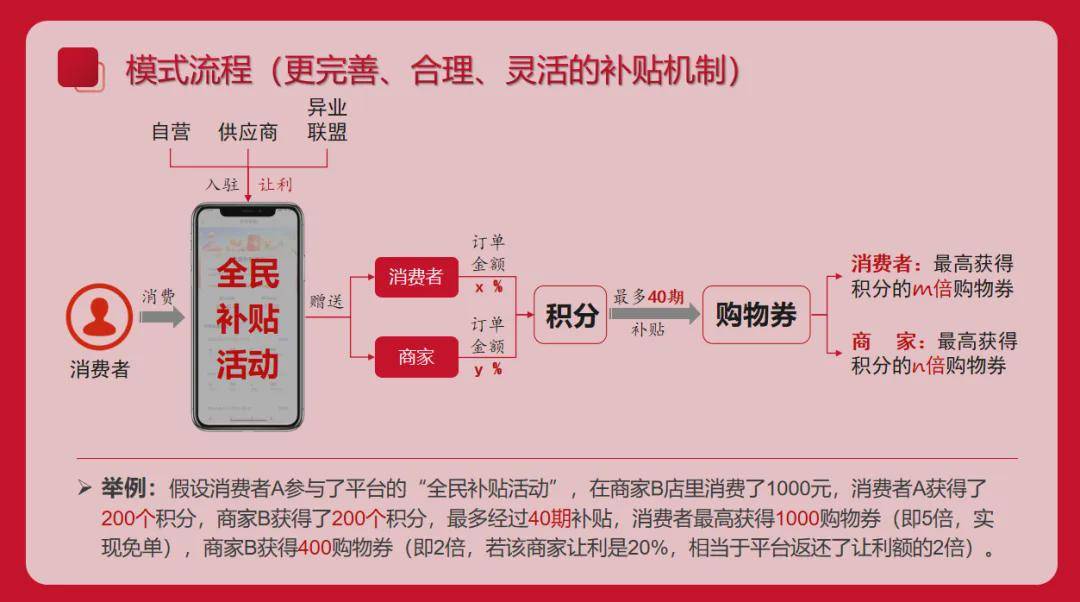 小蔡在平台上的数码店购买 3000 块的手机,按照规矩,他和数码店都拿到了积分,比如说按 20% 算,两边都拿到 600 积分。等平台补贴池里钱够了、业绩也好起来的时候,这些积分就能变成消费券,下次再买东西就能少花点钱,小李心里那叫一个美,以后更乐意在这平台买东西了。