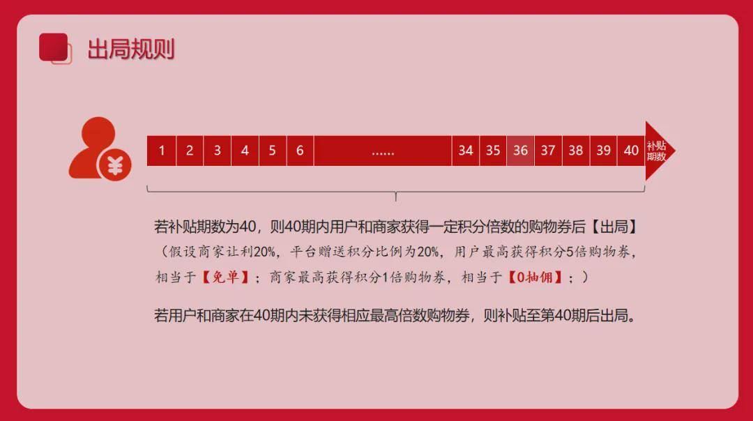 正常情况:若补贴期数 40 期,假设商家让利和平台赠送积分有一定比例,用户和商家达到Zui高倍数购物券后出局。