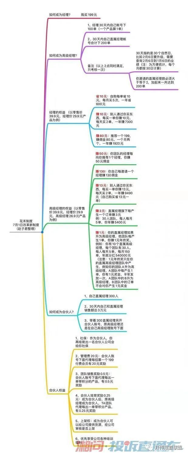 据此来看,“花禾生活”平台以“”为目的的招募行为已然涉嫌传销。据调查发现,该平台的晋级方式有要求,形成多层次,这是典型的涉传模式。花禾生活推出的“”赚钱政策,进去后会被分为经理人和gaoji经理人两个层级,打着成为经理可以卖货赚钱,自己还能拿到折扣的噱头,推出激励计划,不断鼓励会员发展下线“拿奖金”。