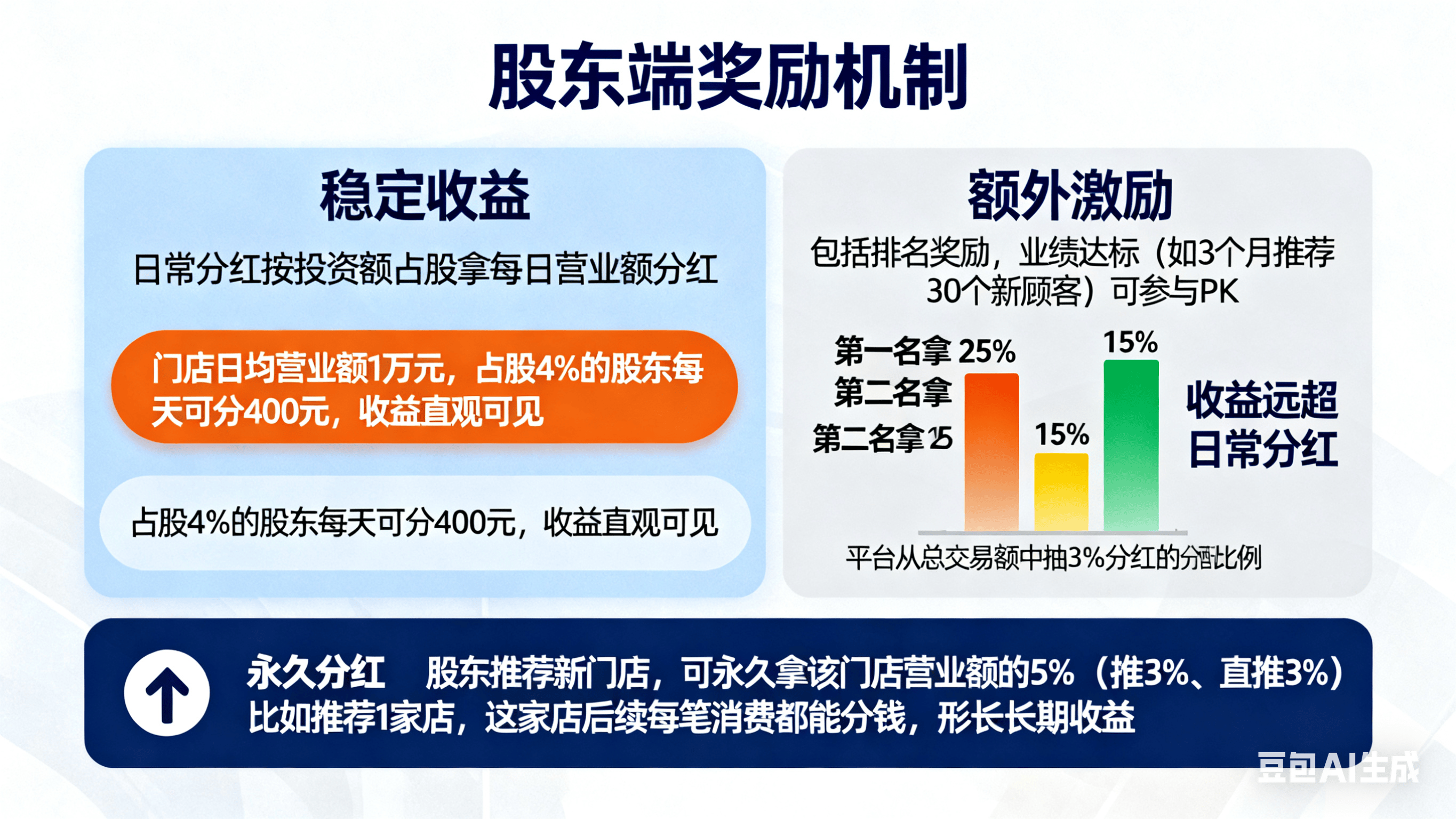 股东的奖励分 “稳定收益” 和 “额外激励”,核心是 “让他愿意投钱、持续拉客”: