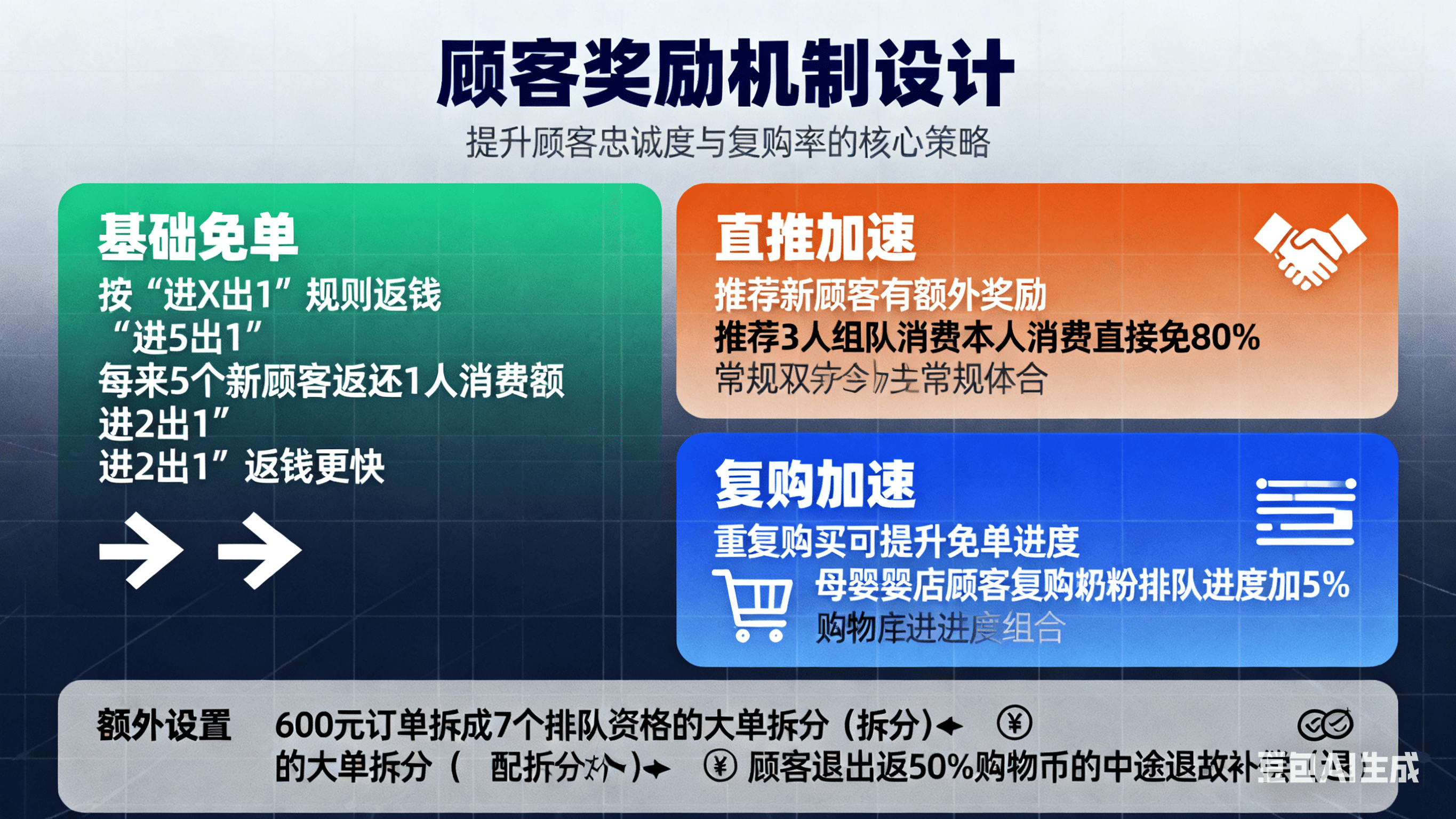 基础免单:按 “进 X 出 1” 规则返钱,比如 “进 5 出 1” 即每来 5 个新顾客,返还 1 人消费额;“进 2 出 1” 返钱更快,降低顾客等待焦虑。
