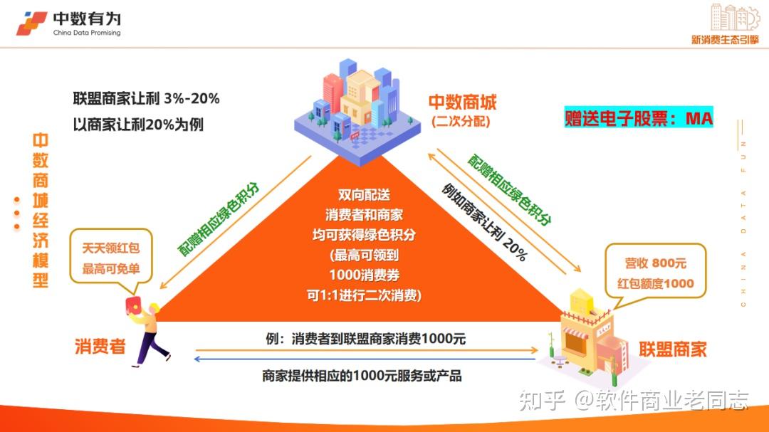 我们用一个具体场景拆解这个闭环:假设消费者在中数有为联盟商家消费 1000 元,商家自愿让利 20%(实际让利比例可在 3%-20% 间灵活调整),此时生态内的 “价值分配” 即刻启动: