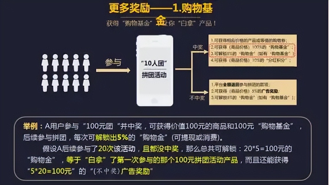 100.%购物基金:中奖金额全额转化为购物基金,但需通过持续参团逐步解锁。比如300元基金,每次参团解锁5%(即15元),20次后全返。这种设计既鼓励用户复购,又避免资金一次性流出。