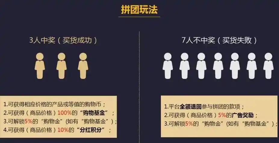 举个例子:某零食品牌推出300元拼团活动,10人成团抽3人中奖。中奖用户直接拿走零食礼盒,还能获得300元购物基金(每次参团解锁5%,20次后全返)、30元分红积分(参与平台月度利润分红);没中奖的用户也不亏,15元现金奖励直接到账,还能解锁15元购物金加速返现。这种“稳赚不赔”的设计,让用户从“怕亏”变成“敢玩”。