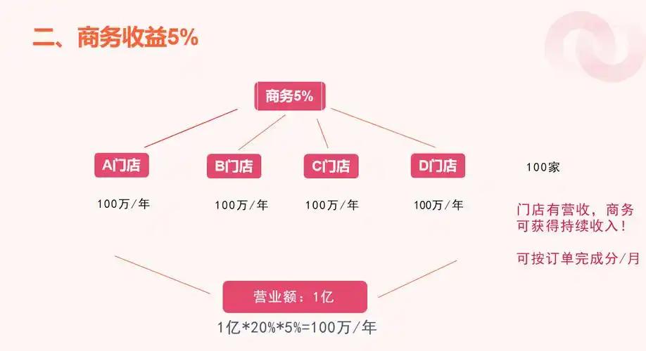 区域分红:优.秀商家可申请成为区域服务商,享受本地业绩提成。杭州合伙人团队6个月内签约800+商家,获取佣金超200万元,通过代理费分成获利60万元。