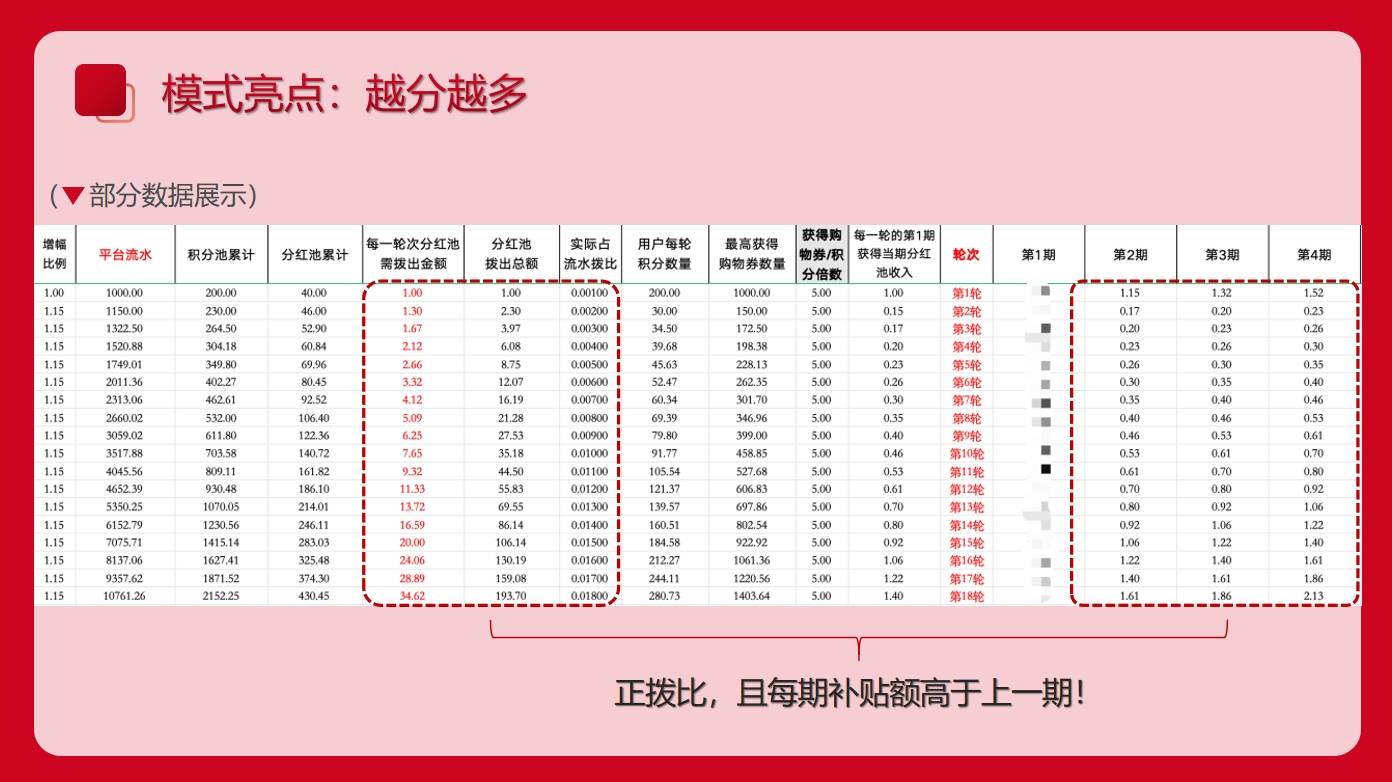 全民补贴模式的亮点在于其独特的分红机制。它打破了传统分红模式前期多、后期少的弊端,实现了前期少、后期越来越多的分红效果。这一创新不仅让商家和用户能够持续受益,也确保了平台的稳健发展。