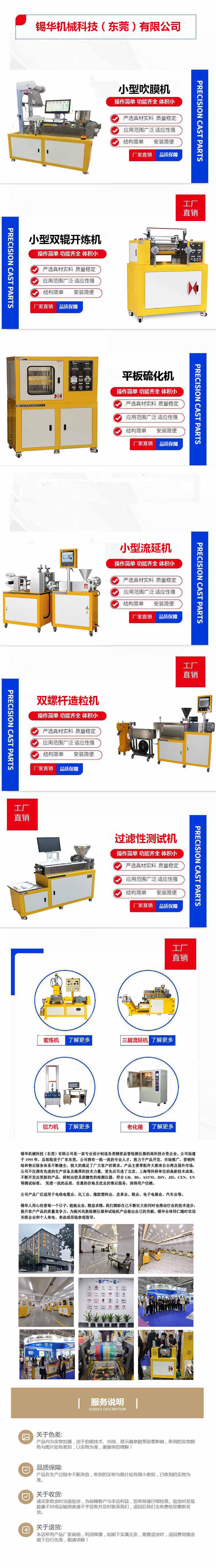 公司核心产品涵盖双辊开炼机(定速/单调频/双调频)(电加热/油加热/自动翻胶)、平板硫化机(手动 / 电动 / PLC/抽真空 PLC 全系列)、橡胶挤出机、吹膜机(单层/三层)、流延机(单层/三层)、双螺杆挤出造粒机(水冷拉条/风冷热切/水下切粒)、过滤值测试机(EN/ASTM)、密炼机91L/3L/5L/10L)、压延机(按键/PLC)、注塑机(20T/25T/40T/60T)、老化机(手动取片/自动取片)、拉力机(2KN/5KN)等,设备广泛适配橡胶、硅胶、复合材料、生物降解材料等加工场景,既满足高校科研院所的小批量研发制样需求,也支撑新能源、医疗、汽车、包装等工业领域的规模化生产。
