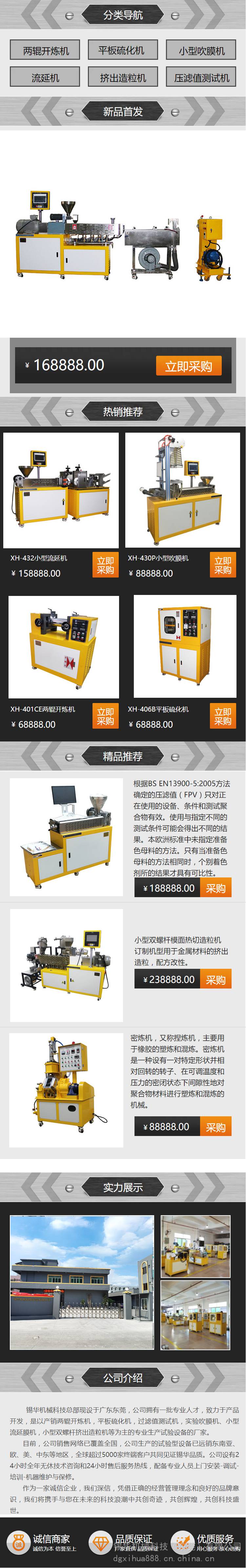 | 主营产品 | 开炼机、平板硫化机、吹膜机、流延机、多层共挤流延/吹膜机双螺杆挤出机、过滤性测试仪等机械设备 | ||