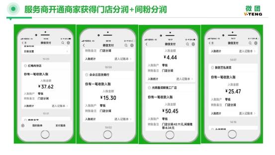 更吸引人的是“跨店分润”——顾客第一次在你家消费就与你绑定,哪怕他之后去别家微团店买衣服、做美甲,你都能拿分成。