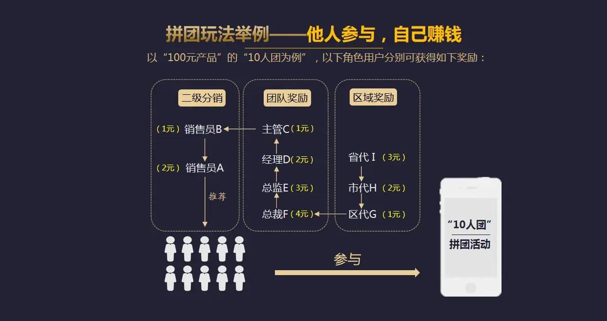 用户通过拼团的形式,以低价购买商品;拼团成功,用户获得商品;拼团不成功,部分或全部金额返还,并可能获得额外奖励;用户通过邀请他人参与还能获得推广收益。