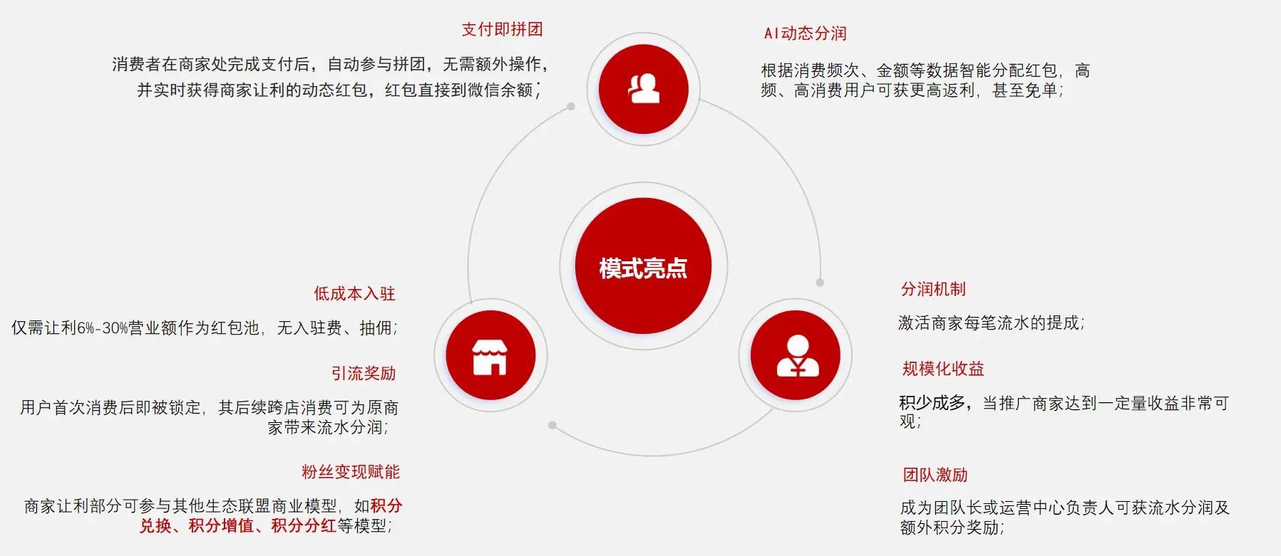 以微信支付生态为底座,将“支付即拼团”与“AI动态分润”融合,用户在合作商户完成微信支付后,系统自动触发拼团逻辑,现金红包直达微信零钱,无需额外操作或拉人组队。