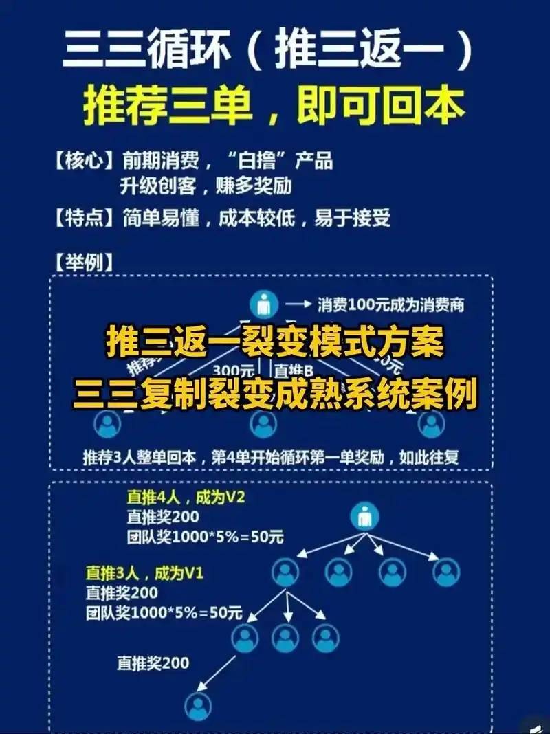 “推三返一”是一种融合裂变传播与利益驱动的分销模式,其核心逻辑为:用户通过分享商品链接邀请3名新客户完成购买后,即可触发免单、现金返佣或高额优惠券等奖励。该模式通过“推荐-获利-再推荐”的循环机制,将用户转化为品牌的主动推广者,实现低成本获客与用户粘性双提升。