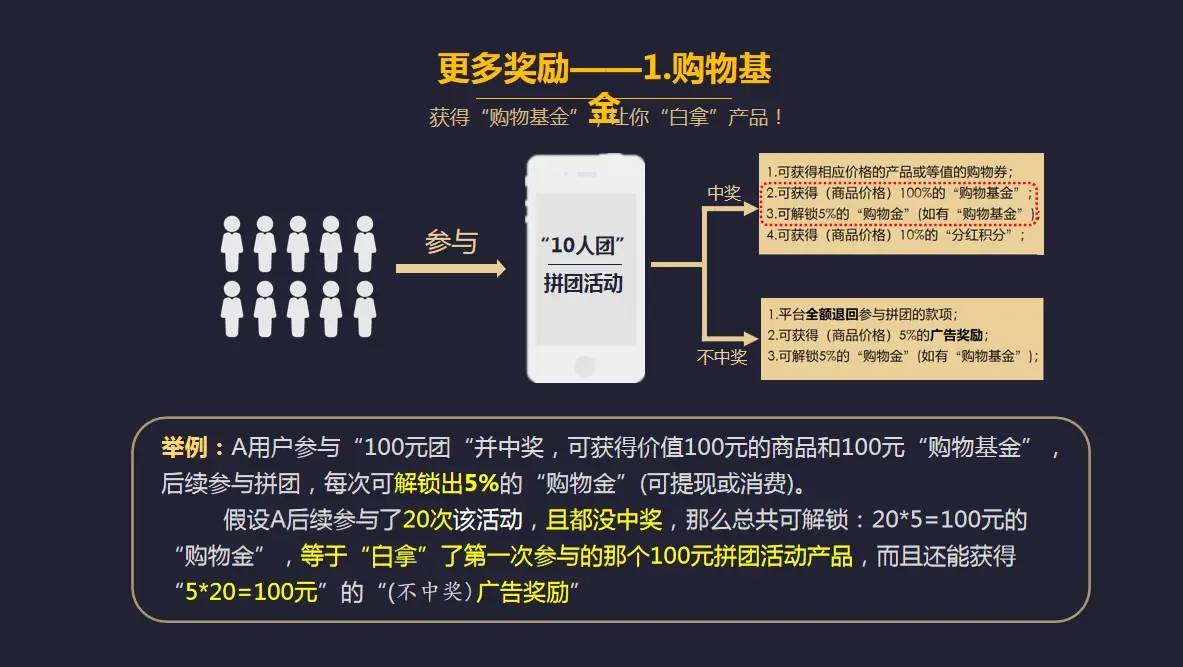 用户端:中奖者获得商品+购物基金(如商品价抵扣额度),未中奖者全额退款并获现金补偿或积分。