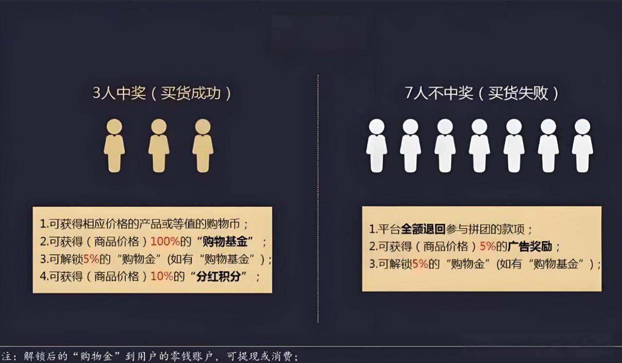 1、多人成团机制:通常以10人团为基准,系统随机抽取部分用户(如30%中奖率)获得商品或权益,未中奖者也能获得补偿奖励。
