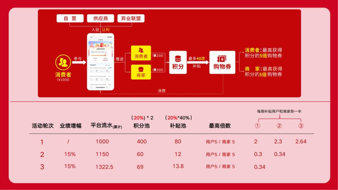 例如,一家超市设定10%的让利比例,用户消费100元,商家获得10积分。3个月后,这10积分可兑换50元消费券,用于采购平台内其他商户的商品。