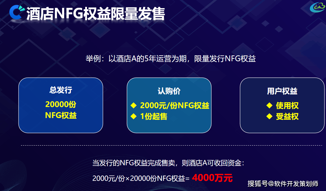 每份数字权益凭证定价固定,总发行量基于酒店运营规模设定。以一家300间客房的酒店为例,计划发行2万份NFG权益凭证,每份定价2000元,总融z额可达4000万元。用户购买权益凭证后,可获得两大核心权益:一是一定次数的住宿权益,可自用也可转赠;二是每年享受纷成,z产可增值转卖。这种权益拆纷方式,降低了投z门槛,吸引了更多普通投z者参与。