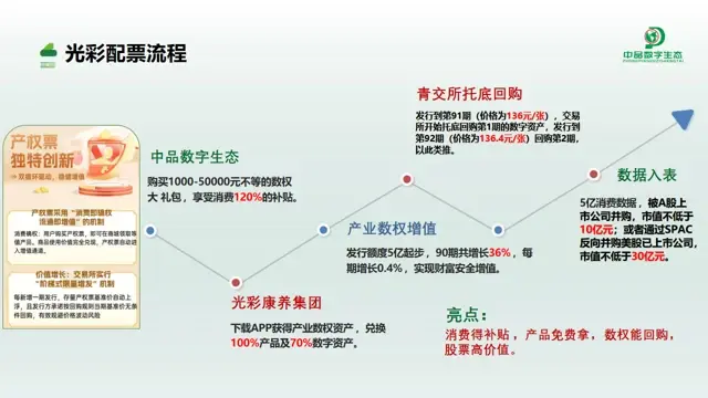 更大的想象空间在于“上市并购”! 像光彩康养这样的企业,计划将汇集到的消费数据(比如5亿规模)打包,通过数据入表,寻求被A股上市公司并购或通过SPAC在美股上市(目标市值10亿甚至30亿以上)。一旦成功,您持有的数权资产就有可能兑换成上市公司股票!想象一下,您日常的消费数据,未来可能成为上市公司的核心资产,您作为数据贡献者(股东)自然能分享这份增值!