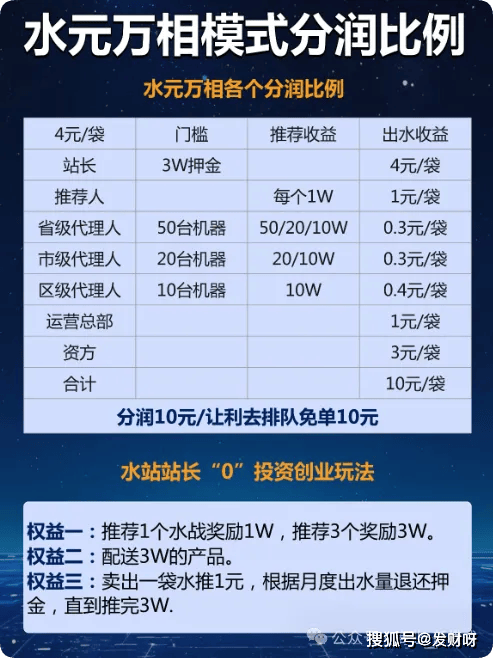 “水元万相”的代理和站长体系,是其快速扩张的关键。以站长为例,交3万押金,就能获得多项权益。每卖出一袋水,站长能赚4元;推荐一个站长,还能获得1万元奖励。押金会按照1元/袋的标准退还,卖够3万袋水,押金就全部退完。