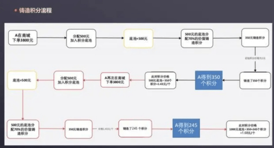 假设你消费了100元,其中70元用于商品成本和平台利润,剩下的30元则用于铸造积分和进入分红池。这些积分不仅具有初始价值,还会随着平台的发展而增值。