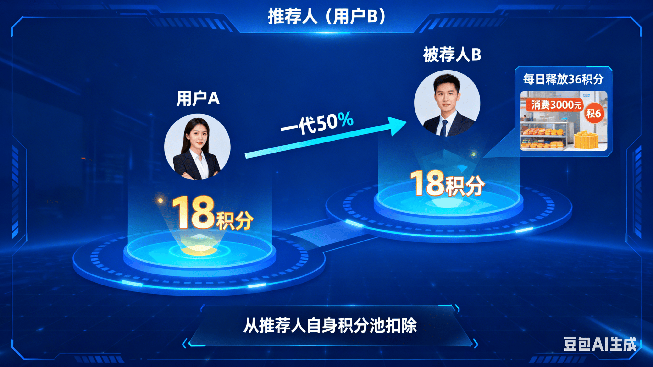 分享收益:推荐新用户注册并消费后,推荐人可获新用户积分释放量一定分成(如一代50%、二代30%)。例如,用户A推荐用户B,B消费3000元每日释放36积分,A可获18积分(从A自身积分池扣除,不增加平台成本),此机制让用户乐于分享消费体验。