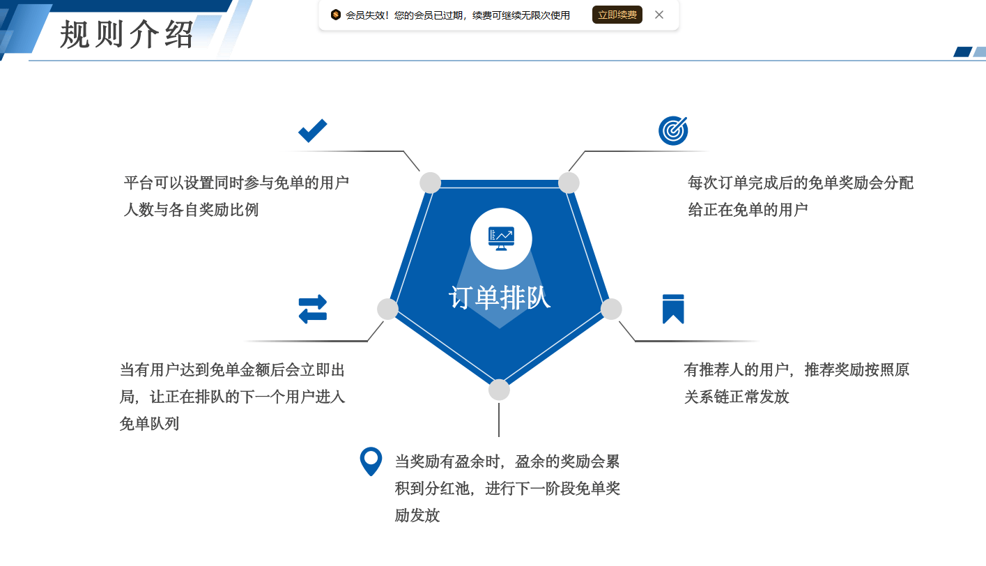 排队机制:用户下单后按时间顺序进入免单队列,平台可设定免单人数及各用户奖励比例。