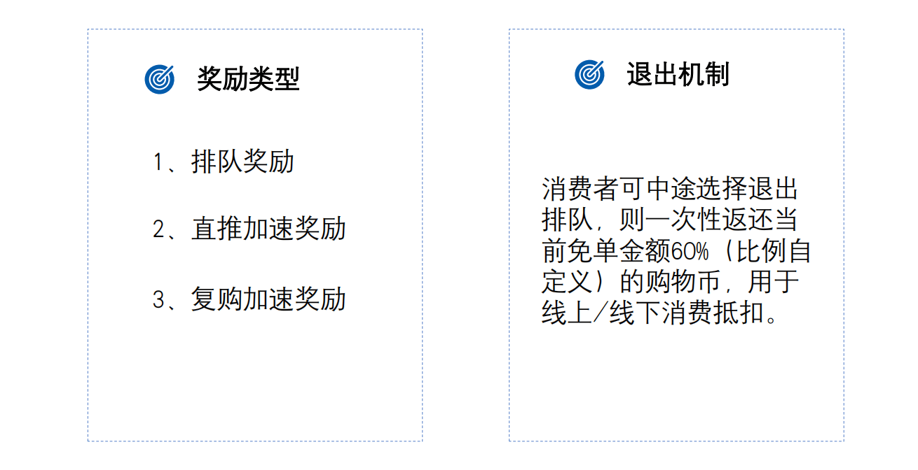 进出机制:用户累计免单达设定值(如订单金额)即出队,后续用户自动补位;中途退出可按比例(如60%)返还购物币。