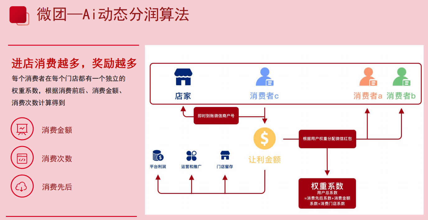 示例:商家让利20%,其中60%作红包发放。用户消费100元,个人权重系数10,门店总权重系数50,则红包 = 100×20%×60%×10÷50 = 2.4元。每笔红包由实时数据动态算出。