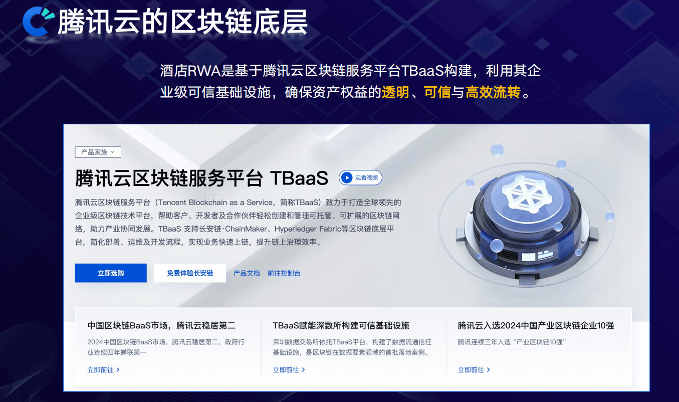 依托腾讯云TBaaS平台,实现酒店实体资产(如房产、收益权)的确权与透明管理。通过智能合约将资产映射为限量NFG权益,每份代表未来收益的一部分,确保数据不可篡改、可追溯。