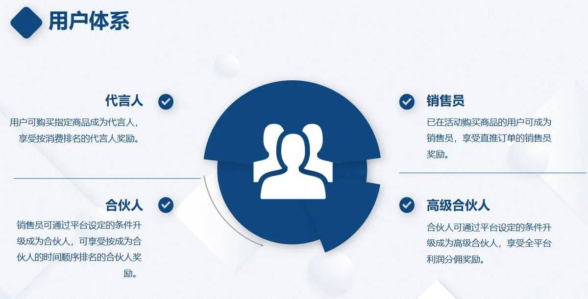 代言人:用户购买指定商品或服务成为代言人,依消费排名获奖励,鼓励早参与,但身份稳定无晋升,提供初步推广奖励入口。
