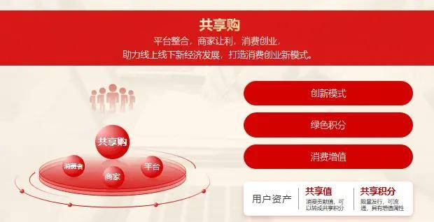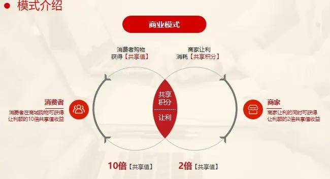 共享值是平台内衡量贡献的指标,消费者与商家通过正常交易获取。消费者购物时,依商家让利比例得“让利额10倍”共享值,如消费1000元,商家让利10%(100元),则消费者获1000个共享值。商家让利时,得“让利额2倍”共享值,如让利100元,则获200个共享值。共享值用于积分兑换、员工激励或吸引新客户,不可直接变现,仅作为兑换共享积分的依据,持有量越多,可兑换的积分亦越多。
