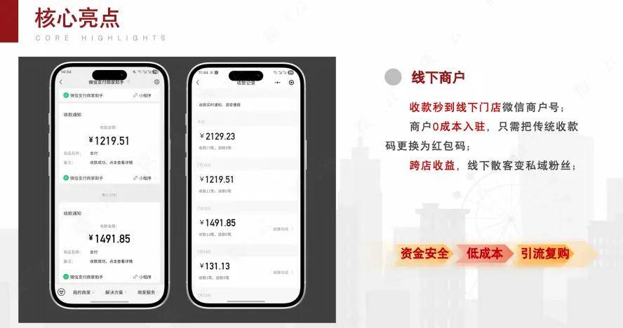 资金安全无压力:微信支付直接将款项到账商户号,没有平台账期的困扰,商家卖多少就能得到多少,资金周转更加灵活。