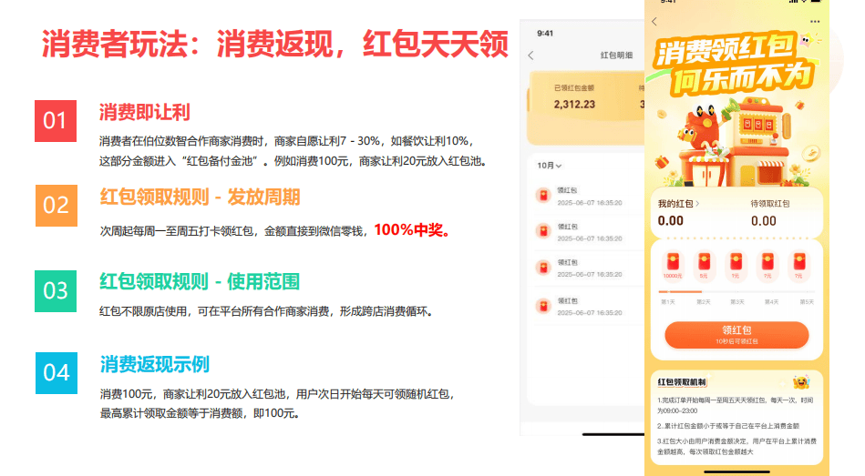 和传统的消费回馈方式不同,数智红包模式以“红包池”为核心,搭建了“商家让利-用户参与-持续互动”的完整闭环,整个过程通过机制设计实现风险可控,具体可从商家、红包池、用户三个维度理解: